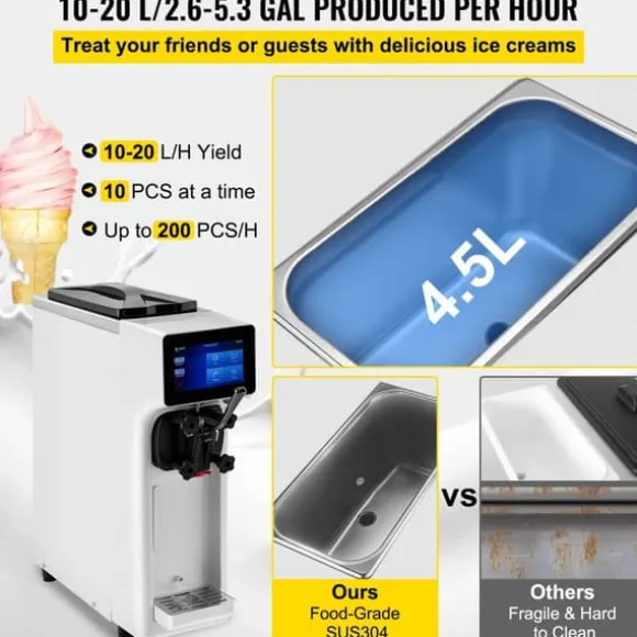 -10-20 L/H Glassutbyte: Vår kommersiella mjukglassmaskin producerar effektivt mjuk och fluffig glass. Den 4,5-liters (1,2-gallon) blandningsbehållaren och 1,6-liters (0,4-gallon) fryscylindern (båda gjorda av 304 rostfritt stål) kan leverera upp till 200 portioner per timme, vilket enkelt uppfyller ditt dagliga hem eller kommersiella behov.