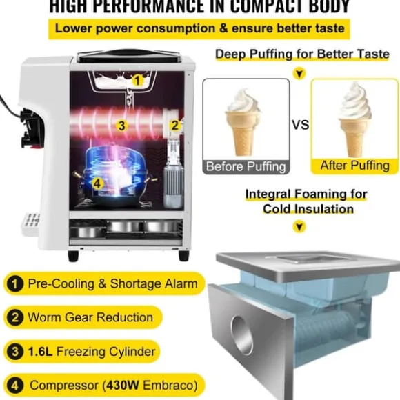 -Omfattande prestanda: 1000W effekt (total effekt) ger vår mjukglassmaskin kontinuerlig och långvarig kraft. Embraco-kompressorn på 430 W är mycket effektiv vid glasstillverkning, och snäckväxelsystemet säkerställer lägre ljud, stabil prestanda och längre livslängd. Den har en förkylningsfunktion, och behållaren och cylindern är inlindade med ett förtjockat övergripande isoleringsskikt för att hålla ingredienserna fräscha längre. Puffande tuber gör att din glass ser snyggare ut och smakar mer utsökt, och de sparar även råvaror.