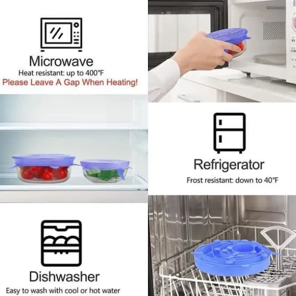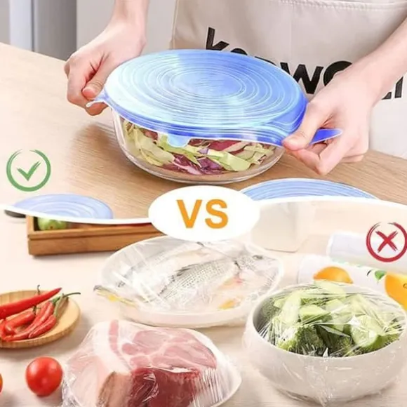 Livsmedelskvalitet: Silikonlocken för livsmedel och skålar använder ett högkvalitativt silikont material och har tjockare kanter för maximal tätning. Dessa är tillräckligt släta, slitstarka och elastiska för att anpassa sig till behållare av olika former för att förhindra spill samtidigt som de håller livsmedlen fräscha.