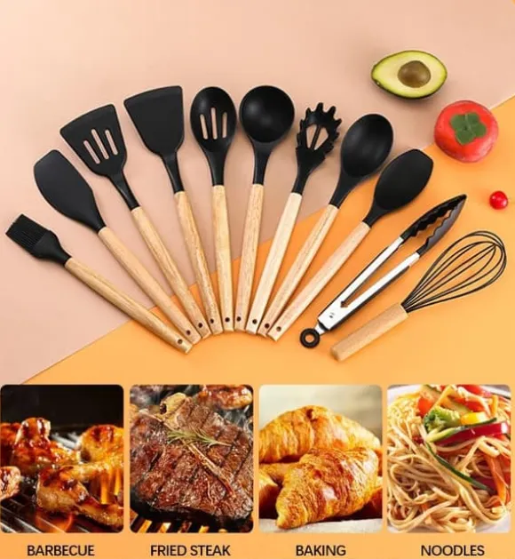 Detta set innehåller totalt 12 delar: 12 köksverktyg och en behållare för dränering. Varje redskap har en specifik funktion och inkluderar spatlar, slevar, en pastaslev, en visp, skedar, tänger och en pensel.