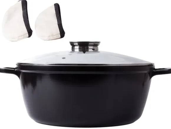 Kastrullen är utrustad medstarka handtag förbekväm hantering. Dessutom ingår ett par värmesäkra handskar (tassar). Dessa kan snabbt och enkelt fästas på kastrullhandtaget för att säkerställa ett säkert grepp och stabilitet.