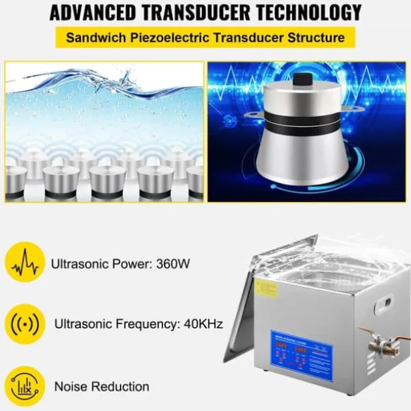 PROMATERIALE SUS304 – Tankstorlek: 15 L / 4 Gal; Ultraschallkraft: 360 W; Värmeeffekt: 400 W. Denna ultraljudsrengörare är tillverkad av robust 304 rostfritt stål, vilket säkerställer att inget vatten läcker ut och ger en lång livslängd. Dessutom finns en extra korg för att minska kollisioner mellan vassa föremål och tanken.