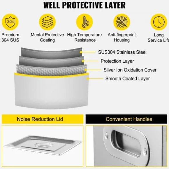 304 ROSTFRITT STÅL – Denna rengöringsmaskin är tillverkad av 304 rostfritt stål, har ett ljuddämpande lock och integrerade handtag på båda sidor, vilket gör den hållbar och lätt att rengöra.