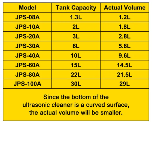 Tankkapacitet: 13,5-15 L (Eftersom botten av ultraljudsrengöraren har en välvd yta, kommer det faktiska volymen att vara mindre).