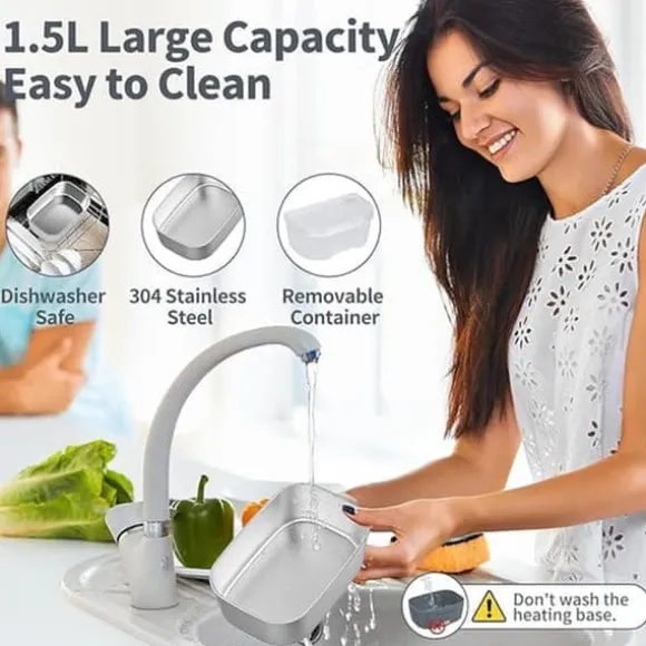 Det avtagbara innerfodret i 304 rostfritt stål har en kapacitet på 1,5 liter, tillräckligt för att rymma en överdådig måltid. Fäst en annan plastbehållare för att förvara frukt eller såser. Innerfodret i rostfritt stål kan diskas i diskmaskin (obs: värmebasen får inte komma i kontakt med vatten).