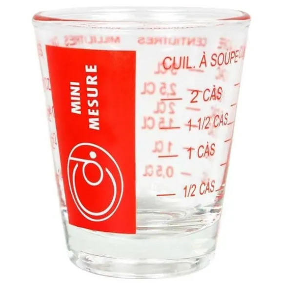 2 mini måttbägare. Denna lilla måttkopp mäter dina ingredienser från 5 till 35 ml. Gradering i milliliter, uns, matskedar, teskedar. Material: glas. Kan även användas som skytt!