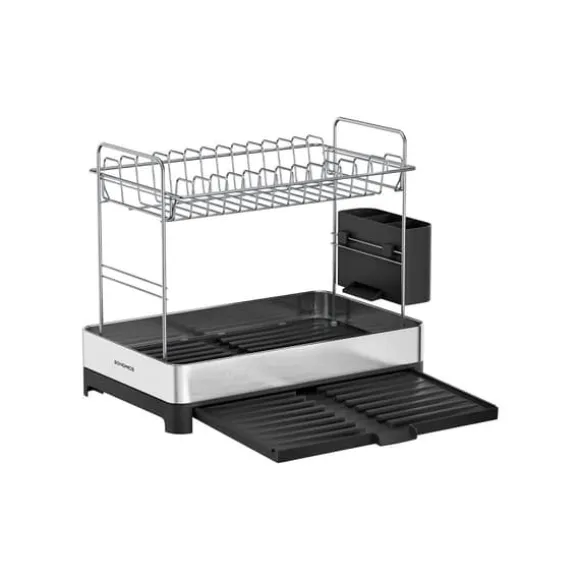 Mooistoerwonen Diskställ, Utdragbart diskställ, Diskställ med bestickhållare, Rostfritt stål, för porslin, knivar, skedar, gafflar, Silver-Svart KCS035B01. Färg: Silver-Svart. Material: Rostfritt stål, PP-plast (polypropylen). Mått: (25-44) x 40 x 33,4 cm (D x B x H). Vikt: 1,6 kg. Maximal total statisk belastning: 22 kg.