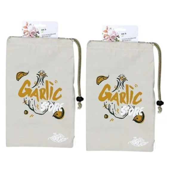 2 förvaringspåsar för vitlöksklyftor. För att förvara dina vitlöksklyftor kommer denna tygpås med dragsko att vara mycket praktisk och tillföra en dekorativ touch till ditt kök. Tygpåsen är vit med mönster av vitlöksklyftor.