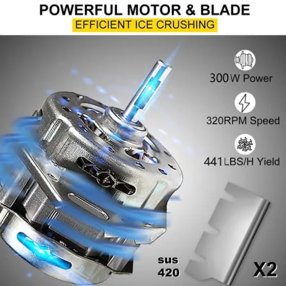 -Effektiv motor och blad: Kraftfull 300W kopparmotor med SUS 420 rostfritt stål vassa blad vid 320 RPM, som kan krossa 200 kg per timme). Denna israkapparat kommer med ett reservblad som enkelt kan bytas ut.