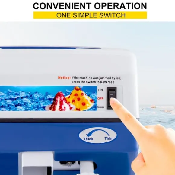 -Enkel manövrering för att möta olika behov: Rakmaskinen är utrustad med enkla knappar för enkel manövrering (på/av/reverse). Reverseringsknappen förhindrar att enheten fastnar i is. Bladjusteringsvredet låter dig justera isens finhet från fin till grov. Det finns en backströmbrytare gömd under dammskyddet (öppna locket när du arbetar, motorn stannar).