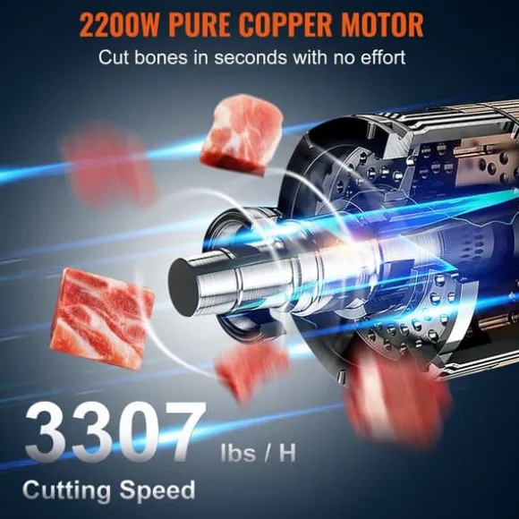 Robust och effektiv: Den 2200-watts motor av ren koppar levererar imponerande prestanda, och det vassa sågsbladet av rostfritt stål tillsammans med det precisionsutvecklade växelsystemet ger en skärkapacitet på upp till 1500 kg/tim. Vår elektriska benkniv skär mjukt och utan att fastna, vilket gör det möjligt att enkelt skära igenom olika hårda ben och fryst kött med ett lätt tryck.
