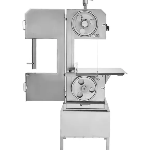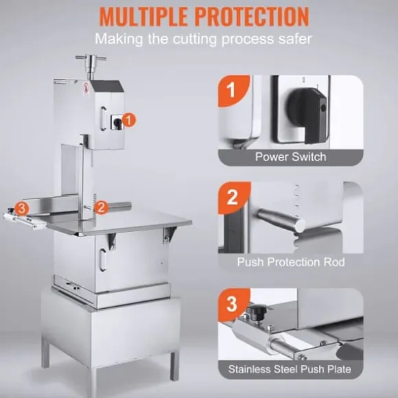 Precis och jämn: Arbetsbordet av rostfritt stål erbjuder en skäryta med precisa skalenheter. Detta gör att den önskade tjockleken kan justeras med högre noggrannhet vid behov. Den kommersiella benknivsmaskinen kan hantera stora bitar av lamm- och nötköttsben. Skärtjockleken kan justeras från 4 till 220 mm, vilket ger utmärkta resultat både för tunna skinkskivor och tjocka benbitar.