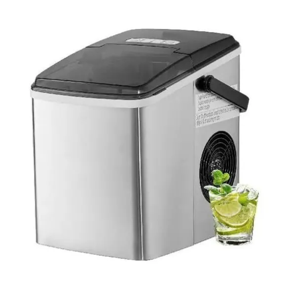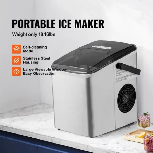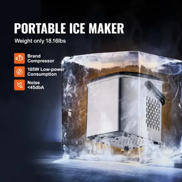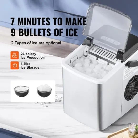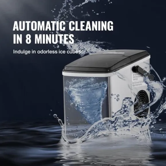 -Denna bärbara ismaskin producerar 26 lbs is per 24 timmar (vid 70°F testmiljö och 59°F inloppsvattentemperatur) och kan förbereda 9 isbitar på 7 minuter. Den har en kapacitet på 1,8 lbs, vilket gör den lätt att ta med till fester och picknickar. Njut av ren is när som helst.