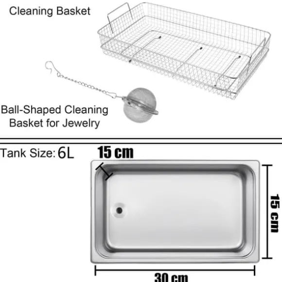 Denna ultraljudsrengöring för smycken har en 6L tank med rengöringskorg och en sfärisk smyckesrengöringskorg för att minska friktionen under tvätt.