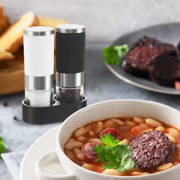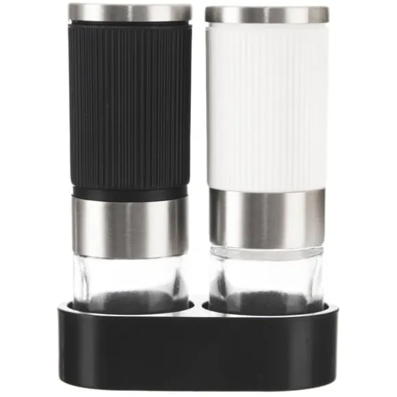 FUNKTIONELL – Med slipmaskinerna kan du justera slipfinheten med en ratt. De är försedda med lock för att förhindra att malda kryddrester rinner ut. De är perfekta för att mala peppar och dispensera salt. Stativet gör det enkelt att förvara behållarna och hålla ordning på köksbänkar och bord.