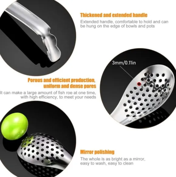 [Antal och storlek] Du får 3 små hålskedar, vardera 17*4,3 cm med ett långt handtag, vilket gör dem till den perfekta storleken för att ta bort oliver, kapris och annan saftig mat från burkar utan att det kladdar eller droppar. [Premiummaterial] Sfäriseringsskedarna är tillverkade av rostfritt stål med en spegelblank yta för en ljus, ren yta som inte bleknar eller missfärgas. De är hållbara och kommer inte att buckla sig, spricka, rosta eller skala. [Utmärkt design] Kaviarskedarna har en enhetlig, tätt packad håldesign, vilket gör sfäriseringen enklare och snabbare. De är det perfekta verktyget för att tillaga olika smaker av kaviar och effektivt tillgodose dina behov. [Perfekt avrinningsked] Avrinningskeden låter dig sila vätska samtidigt som du tar bort oliver och kapris från burkar utan överflödig saft, vilket gör den till en mångsidig sil för kapris, kryddor, chutneys och mer. Används ofta: Denna perforerade sked är inte bara lämplig för att tillaga olika typer av kaviar, såsom honungskaviar, juicekaviar och dessertkaviar, utan är också idealisk för molekylär gastronomi, silning och omrörning av smårätter.Förpackningens innehåll: