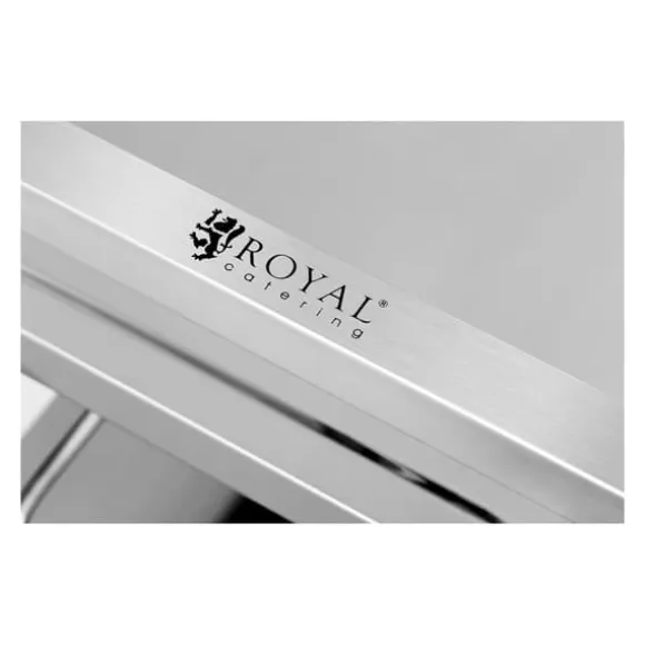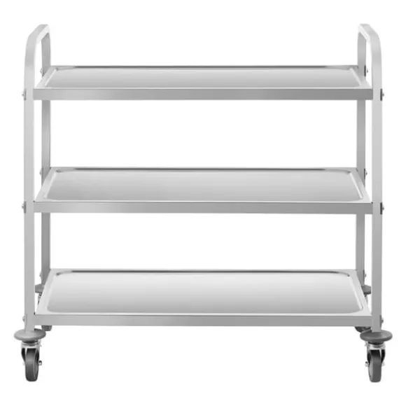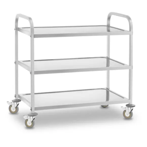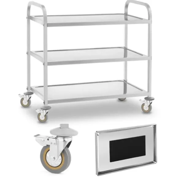 Servitörsvagnen är tillverkad helt i rostfritt stål och har tre hyllplan med en maxlast på 150 kg.