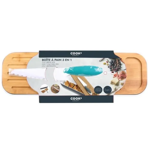 Tack vare det,måltidsberedningen blir snabbare och mer effektivoch ditt kök blir merorganiserad.Brödbehållaren med inskriptionen är inte barapraktisk lösningmen också ett vackert tillskott till ditt kök.Styrelsen, som också fungerar som lock, är gjord avbambu, vilket garanterarhållbarhet och elegans. Det speciellakniv gör att skära och hacka mat lättare.
