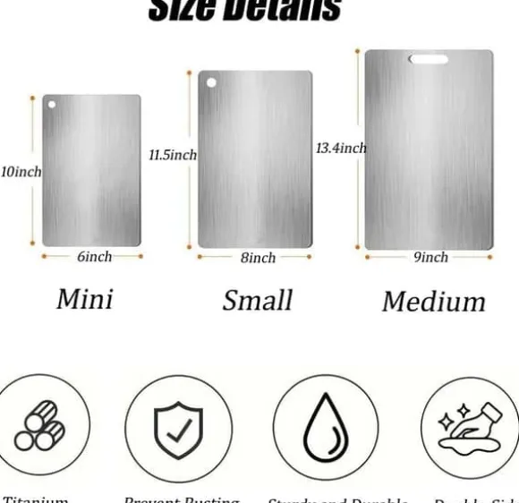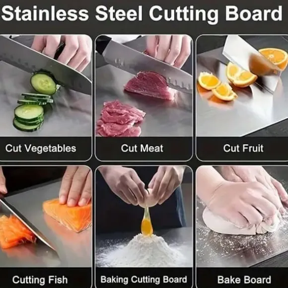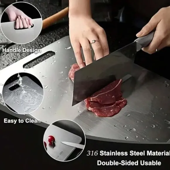Tillverkade av förbättrat rostfritt stål motstår dessa skärbrädor sprickor, deformation och luktbindning. Den dubbelsidiga designen separerar säkert rå köttbearbetning från frukt/grönsaker, vilket eliminerar korskontaminering. Enkelt att rengöra i diskmaskin