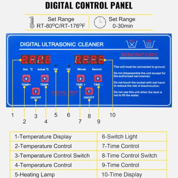 – Justerbar tid/temperatur: Tiden kan justeras mellan 0 och 30 minuter, och temperaturen kan ställas in från rumstemperatur till 80°C, vilket visas på en LED-skärm. Värmefunktionen förbättrar rengöringseffektiviteten avsevärt. Obs: När ultraljudsfunktionen är aktiverad fortsätter temperaturen att stiga även efter att det inställda värdet har uppnåtts. – 30-liters vattentankkapacitet: Denna ultraljudsrengörare för smycken har en stor 30-liters vattentank och levereras med en rengöringskorg och en sfärisk smyckesrengöringskorg för att minska friktionen under rengöringsprocessen.