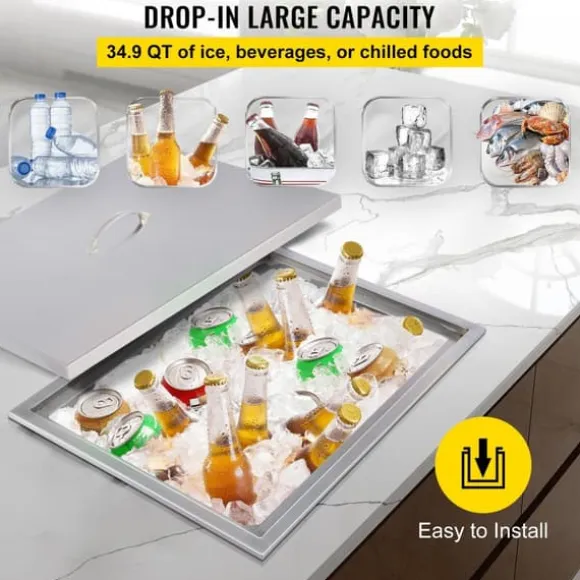 Denna 33L Drop-in islåda är en viktig del av alla matserveringar, och erbjuder robusta fack för att lagra färsk is och drycker. Perfekt för utomhuskök, fester, resorter, barer och mer.