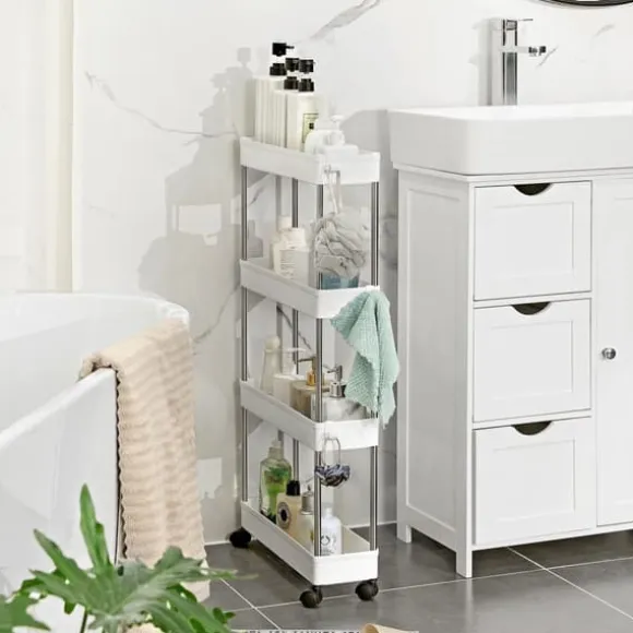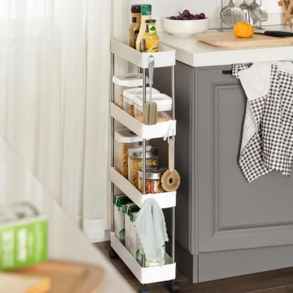 Allt inom räckhåll: Utrustad med 4 högkvalitativa PP-plasthyllor och stöttad av robusta järnrör, erbjuder denna vagn tillräckligt med utrymme för alla de föremål som ännu inte har hittat en permanent plats i ditt hem. Allroundvagnen kan också lätt bära deras vikt. Tack vare sin kompakta storlek (40 x 13,5 x 86 cm) passar serveringsvagnen även perfekt i badrummet för förvaring av skönhetsprodukter, i köket för förvaring av köksredskap eller på kontoret för förvaring av dokument.Produktdetaljer:Färg: VitMaterial: PP (polypropylen), järnrörTotal storlek: 40 x 13,5 x 86 cm (L x B x H)Vikt: 1,3 kgMax. statisk lastkapacitet: 20 kg (5 kg per nivå)Leveransomfattning:1 x vagn3 x krokar1 x instruktioner (DE, EN, DE, FR, ES, IT)SONGMICS Noteringar:Montera endast produkten enligt beskrivningen i dessa instruktioner. Använd inte våld för att demontera den.varje hylla rymmer upp till 5 kg. Förvara inte tyngre föremål på produkten.