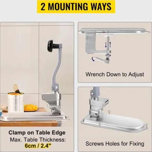 Det finns två sätt att montera denna konservöppnare på ditt förberedande bord. Sockeln är utformad med skruvhål för fixering. Du kan också klippa den till kanten av ett bord. maximal. Bordstjocklek: 2,4 tum/6 cm.