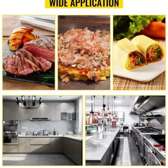 – Tillräcklig matlagningsyta: Denna kommersiella elektriska stekpanna har en kraftig kokplatta i gjutjärn med en stor kokyta och en tjocklek på 0,3 tum (8 mm). Den helt plana ytan värms jämnt för konsekventa tillagningsresultat, vilket gör den perfekt för en mängd olika livsmedel.