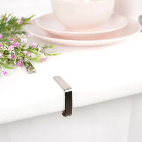 En uppsättning med fyra stålduksklämmor. De hjälper till att hålla ditt bord organiserat och estetiskt tilltalande. De är användbara i alla hem, trädgårdar, terrasser eller balkonger. Oumbärlig under blåsigt väder under utomhusfester eller picknick. Klämmor förhindrar att materialet förskjuts och skrynklas.