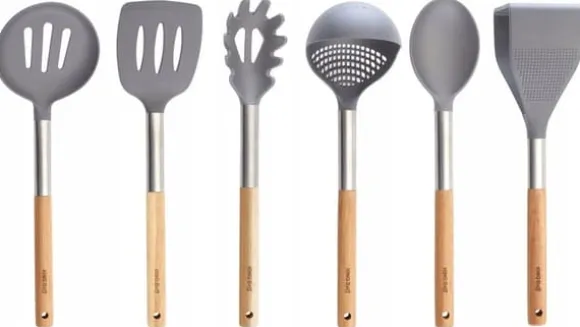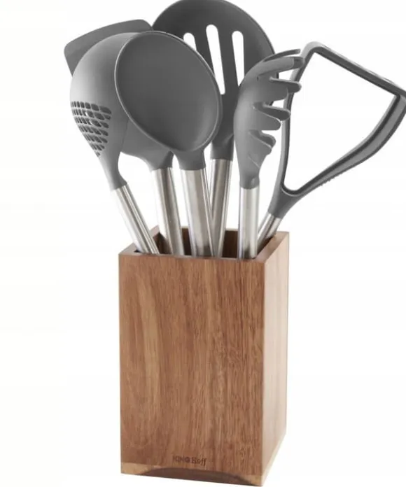 En uppsättning köksredskap av akaciaträ och termoplastisk nylon. Redskap dedikerade till disk med teflon och keramiska beläggningar som är känsliga för repor. – Endast ekologiska och säkra material användes. – Nylondel som tål temperatur upp till 200°C – Produkter som inte repar ytan, avsedda för alla typer av disk. – På grund av det naturliga träet som används som handtag rekommenderas inte diskmaskinsrengöring. I setet ingår stativ i akaciaträ, mått 10,5 x 10,5 x 16,5 cm. I setet ingår: 1 x hålslev 1 x klassisk sked 1 x pastasked 1 x spatel med hål 1 x slevsked 1 x potatisstötare