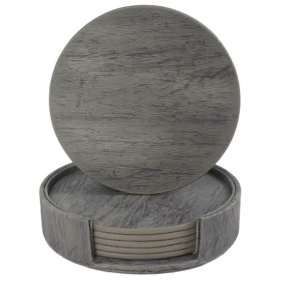Sats med 6st vändbara glasunderlägg med grå trä-design i konstläder med matchande hållare. Mönstret kan skilja sig mellan varje underlägg och sida.