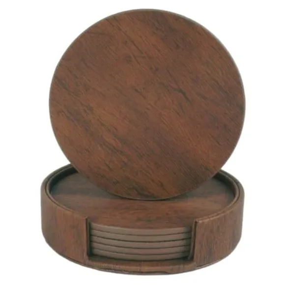 Sats med 6st vändbara glasunderlägg med brun valnöt-design i konstläder med matchande hållare. Mönstret kan skilja sig mellan varje underlägg och sida.