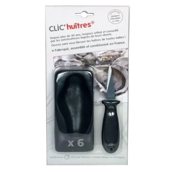 6 ostronklyftor. Denna produkt har designats och producerats för att förenkla öppningen av ostron och undvika att skada dig och bli smutsig så mycket som möjligt. Tillverkad av gummerat material gör det att du kan underhålla ostronet, oavsett storlek, med effektivitet och säkerhet. Dess lansett har ett mycket penetrerande blad tillverkat av premium rostfritt stål. Ostronkilen möjliggör återvinning av havsvatten från ostronet. Praktiskt, ostronkilen placeras på kanten av ett bord eller arbetsyta för mer stabilitet. Du behöver bara föra in bladet på lansetten i ostronskalet för att skära av muskeln som håller skalet stängt och presto, öppna ostronet. Produkt tillverkad, monterad och förpackad i Frankrike. Mått: 14 x 6,5 x H 3 cm. Material: PVC, rostfritt stål, ABS. Svart färg