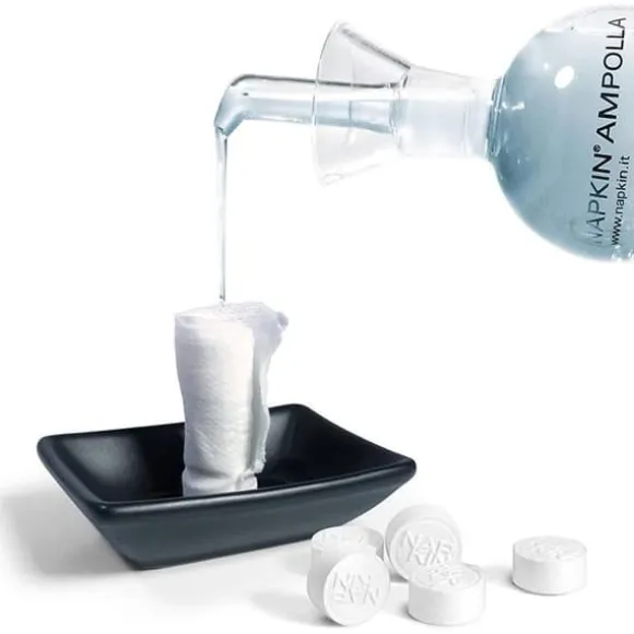 Dessa engångsservetter komprimeras till formen av stora aspirintabletter. Häll bara vatten på den för att fälla ut handduken. Original och chic, denna uppfriskande handduk är värd fantastiska restauranger! 6 tuber med 10 engångshanddukstabletter.