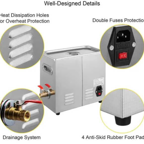 -Användarvänlig design: Denna ultraljudsrengörare för skrivbordet är designad för bättre kundanvändning: bärbart handtag, värmeavledning, halkfria gummifötter, lock och knoppar för att justera funktioner.