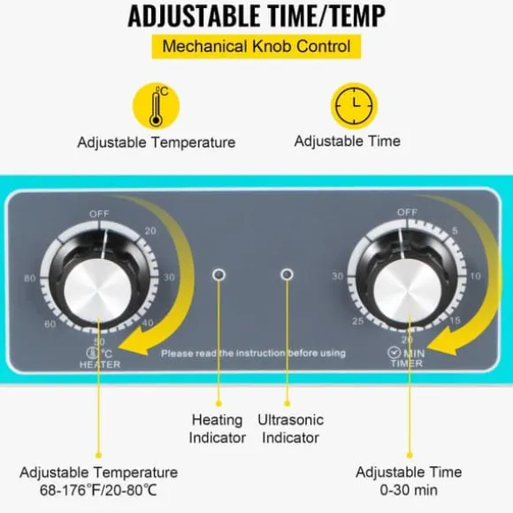 Verklig rengöringstid på 180 W (1-20 minuter justerbar); kan också värma vätskan mellan 20 och 80 ℃ (justerbar). Mikrochip-styrd maskin med 2 mekaniska knappar för att justera funktionerna. Få tillbaka dina värdesaker i nyskick efter att den är klar.