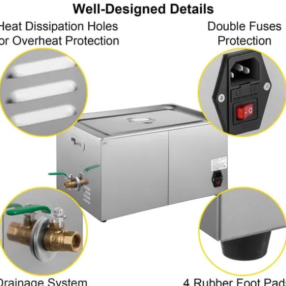 -Användarvänlig design: Denna kommersiella ultraljudsrengörare med värmare är speciellt utformad för bättre kundanvändning. Fyra halkfria gummifötter håller maskinen stabil under drift. Dräneringssystem med ventil i botten för att underlätta dräneringen av restvatten och hålla området rent.