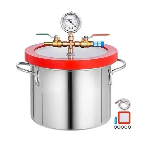 -Kammare i rostfritt stål: Kapacitet: 6L. Tillverkad av höghållfast rostfritt stål, denna vakuumkammare är ett stycke som är extremt hållbar och tål temperaturer upp till 160ºF, vilket bibehåller ett vakuum under långa tidsperioder. Stöder vakuumnivåer ner till 29,9″ Hg.