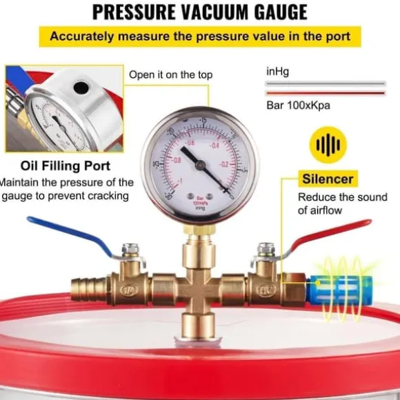 -Precisionsvakuummätare: Vakuumavgasningskammaren är utrustad med en precisionsvakuummätare. Det kan göra mätaren exakt till inom 0,5 inHg. Vakuummätares mätområde: 0-30inHg. Vakuummätaren är fylld med silikonolja, som är stötsäker och hållbar.
