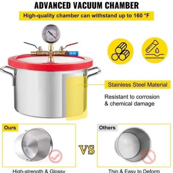 Denna vakuumkammare med hög kapacitet är en robust behållare av rostfritt stål med en kemikaliebeständig silikonpackning som tål tryck upp till 160ºF, vilket gör den tillräckligt hållbar och hållbar för att hålla dig länge. Strukturen är stabil, vakuumet är högt och du kan snabbt pumpa luft.