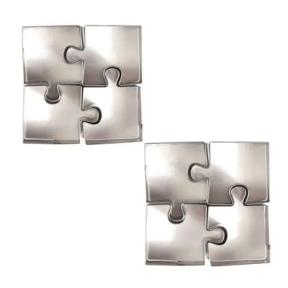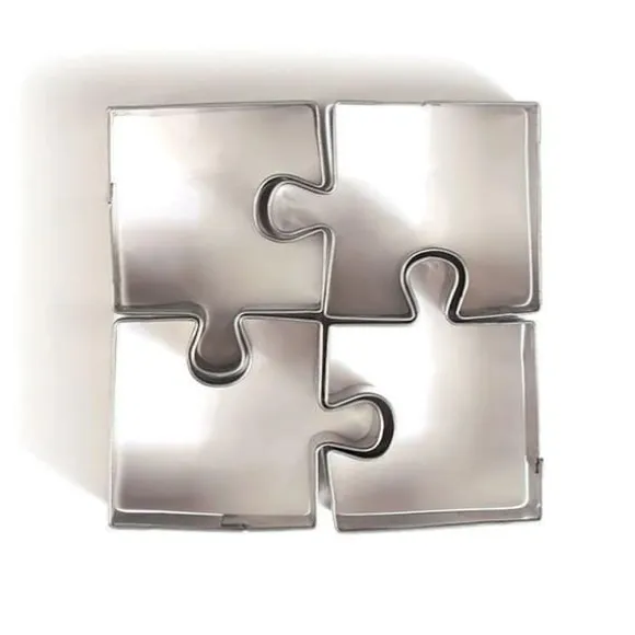 2 kit med 4 kakformar för bakverk eller polymerlera. Dessa kakformar i rostfritt stål representerar en fyrkant uppdelad i 4 pusselbitar. Naturligtvis är dessa kakformar livsmedelsklassade och låter dig skära kakor, baka pepparkakor, marsipan, men även polymerlera. Mått på pusselbitarna: 3,5 x 3,5 cm.