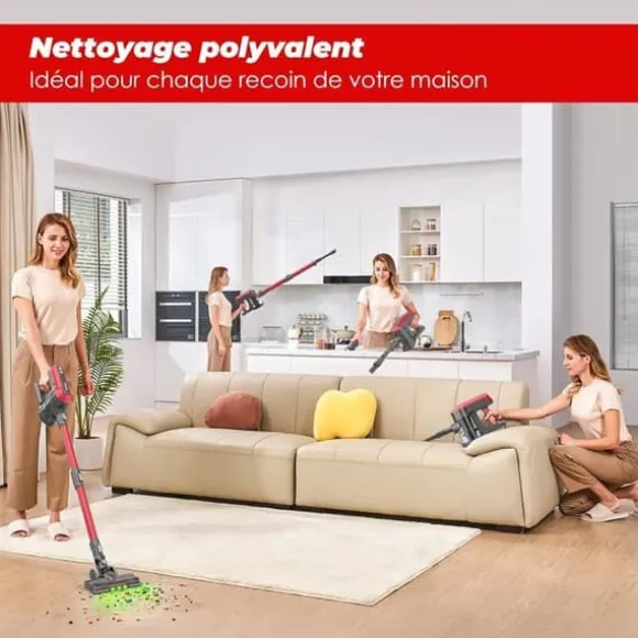 Den 3:e generationens borstlösa BLDC-motor på 450 W erbjuder ett sugkraft på upp till 45 000 Pa, vilket garanterar djupgående rengöring genom att enkelt lyfta damm, skräp och husdjurshår från olika ytor – mattor, trägolv eller kakelgolv. Utrustad med ett integrerat lithiumbatteri med 8 celler, fungerar denna enhet i upp till 60 minuter i ECO-läget, 25 minuter i normalt läge och 10 minuter i Max-läget. Den laddas helt på endast 4 till 5 timmar, vilket är idealiskt för effektiv rengöring av hela hemmet. Med en vikt på bara 2,15 kg är det den lättaste högpresterande trådlösa dammsugaren på marknaden. Utrustad med en motoriserad turbo-borste utan sammanflätning (Tangle Free) och gröna LED-lampor som guidar dig enkelt för att upptäcka smuts och skräp. Inkluderar en väggfäste och levereras med ett extra HEPA-filter kostnadsfritt.