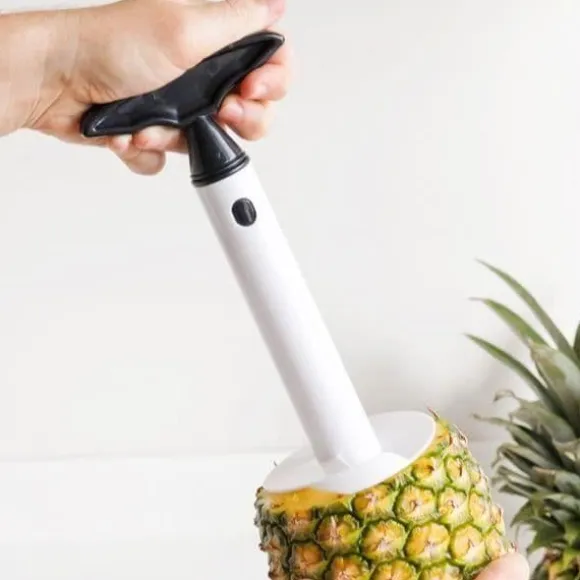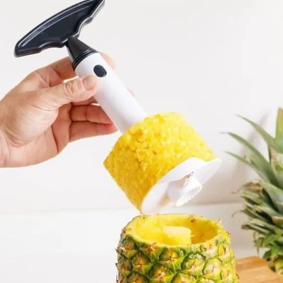 SHOP-STORY ananasskäraren skalar, kärnar ur och skär dina ananas enkelt i skivor. Tillverkad av slitstark plast med stålblad, den är ergonomisk och enkel att använda. Perfekt för vanliga skivor, den bevarar barken för dina presentationer. Mått: 10,5 x 22 x 9 cm.