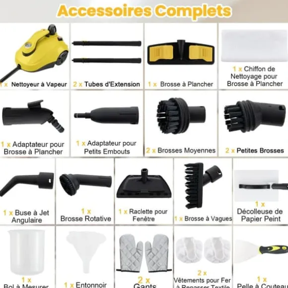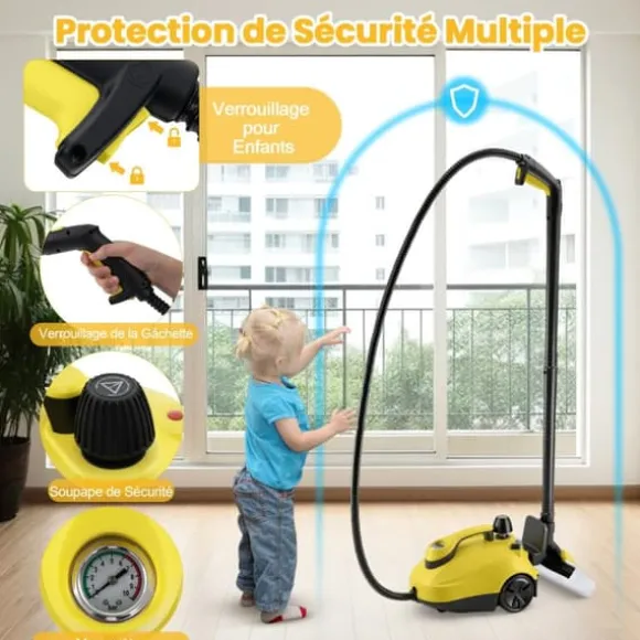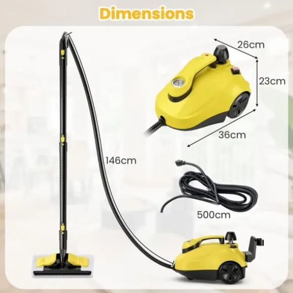 Denna 2000W ångtvätt levererar högtrycksånga upp till 160°C för effektiv borttagning av smuts och fläckar på olika ytor. Den har en stor vattentank för förlängd rengöringstid, flera säkerhetslås och mångsidiga tillbehör för olika rengöringsuppgifter, allt utformat för enkel manövrering och effektiv användning.