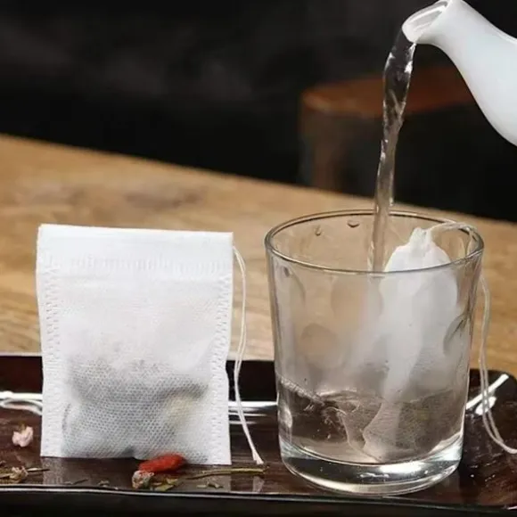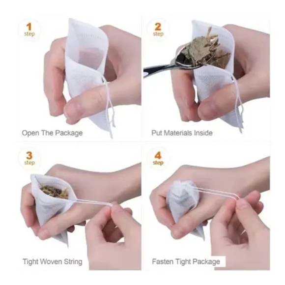 Förpackning med 100 tomma tepåsar för löste. Varje påse rymmer 3-8 g te, örter eller växter och återförsluts med ett snöre. Perfekt för hemmagjorda teblandningar.