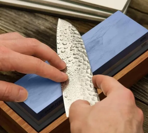 Dubbelisidiga slipstenar (400/1000 och 3000/8000) för högprecision vid slipning av köksknivar, friluftsknivar och saxar.