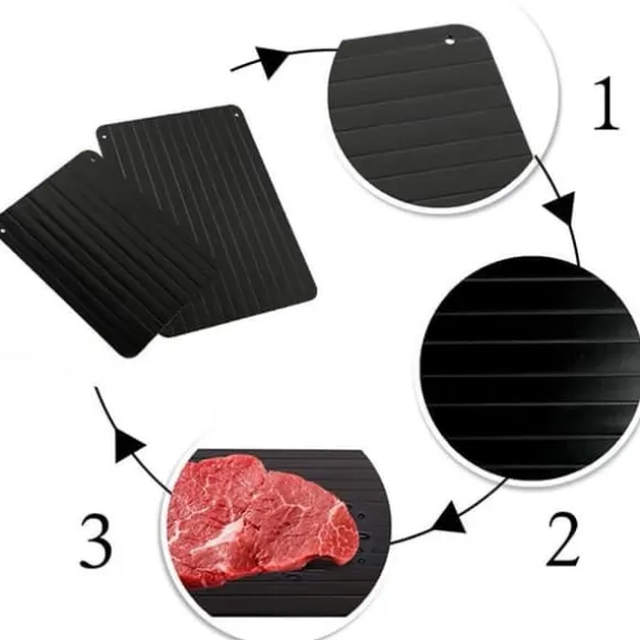 Denna avfrostningsbricka i aluminium gör att du snabbt kan tina upp din frysta mat. Med sina mått på 29,5 x 20,5 cm är den idealisk för kött och frukt. Dess svarta färg och rektangulära design passar perfekt in i ditt kök.