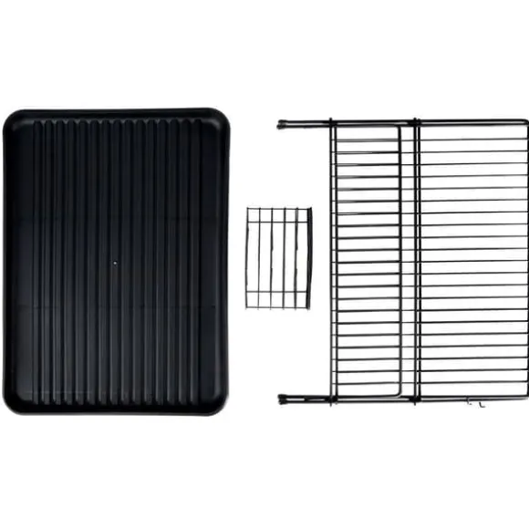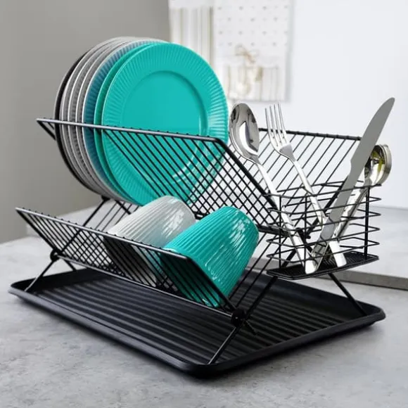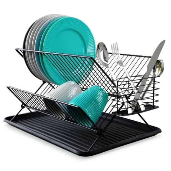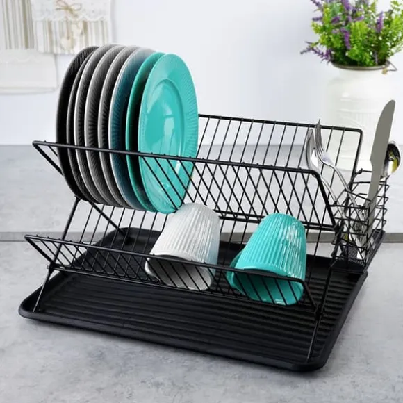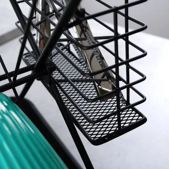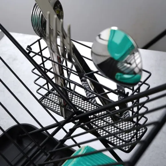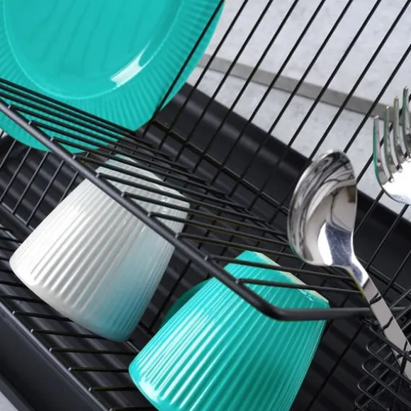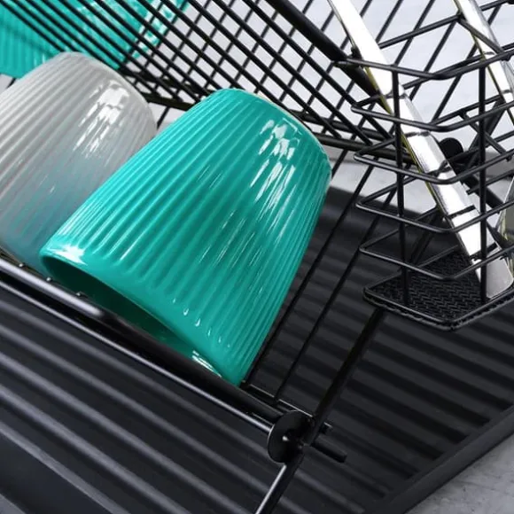 Två-stegs diskavlopp som mäter 45 x 32 x 25,5 cm. Tillverkad av svart metall. Drain är extremt rymlig, eftersom den har plats för tallrikar, muggar, glas och skålar. Lätt att rengöra. En viktig del av köksutrustning. Torktumlaren ser extremt elegant ut och kommer att se vacker ut i alla kök.
