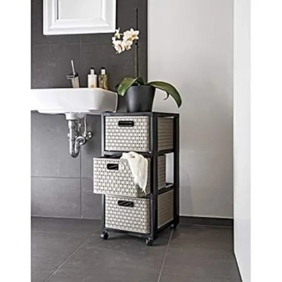 RULLKONTENJER ROTHO Country, med 3 BPA-fria plastlådor, erbjuder en kapacitet på 18 liter var och en. Dess design i anthracite rotting passar perfekt in i badrummet, köket eller barnrummet. Lätt att flytta tack vare sina 4 hjul, kombinerar den praktisk användning med estetik.