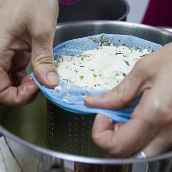 - För att uppnå bästa möjliga vassleavrinning och jämnhet av osten, placera ostmassan på den inre, släta sidan av duken.